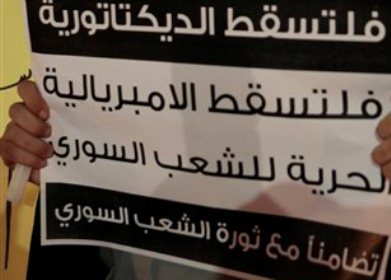 The demonstrators stood a few meters away from the border crossing, carrying banners and shouting slogans against Syrian President Bashar al-Assad’s regime, amid a heavy security deployment, the radio network said.